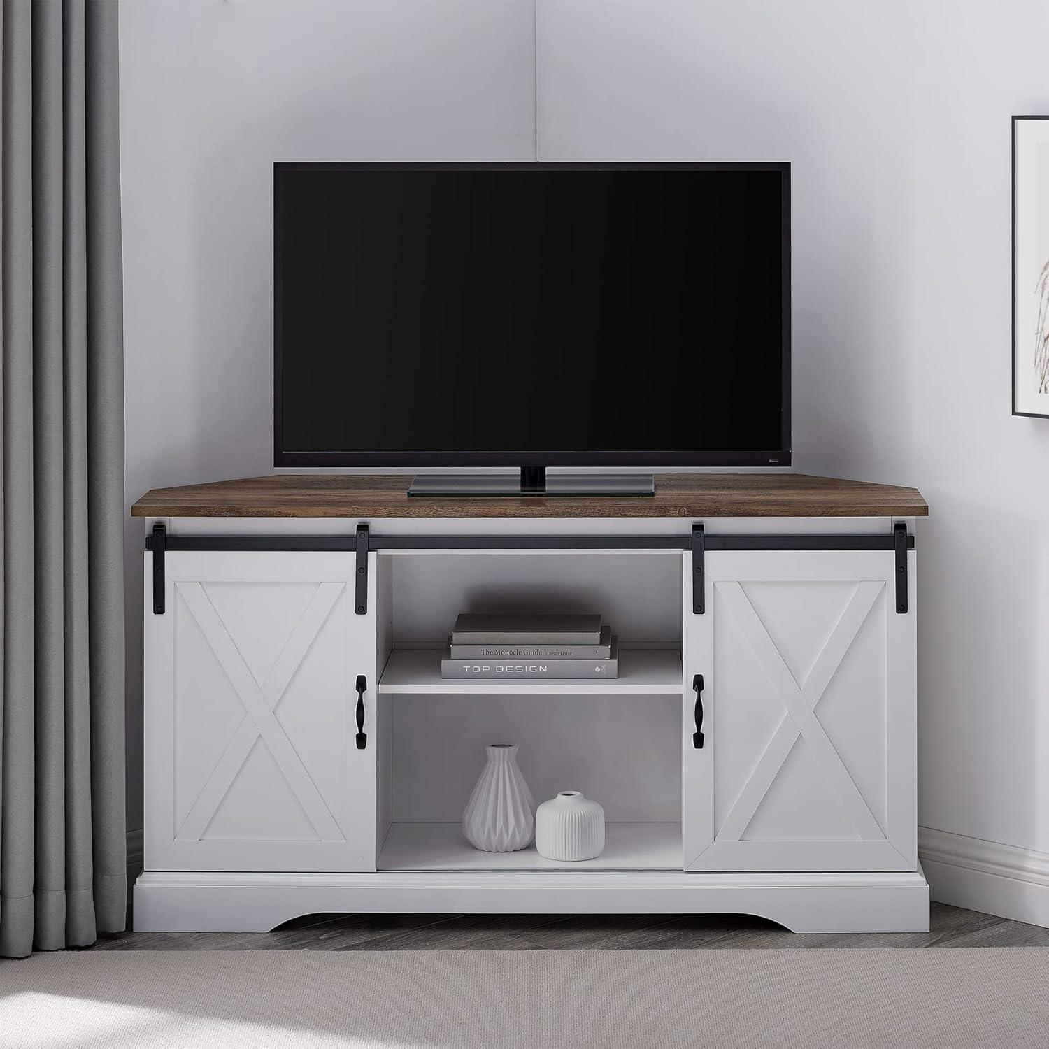 Rustic sliding barn doors are the crowning feature of this modern farmhouse TV stand. Simply slide them on the smooth, exposed hardware for a combination of open and closed storage that presents an organized feel with easy access to essentials. The corner fit allows this entertainment center to fit into your small space living room with ease. Three adjustable shelves provide customizable organization for storing board games, setting up media components, or displaying seasonal decor. And the warp-resistant MDF wood build offers a long-lasting TV console to elevate your home for many years to come.